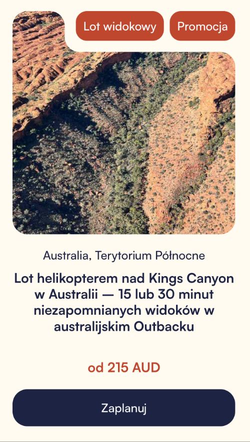 Planujesz roadtrip kamperem z Alice Springs w stronę Kings Canyon? Warto rozważyć lot helikopterem nad Kings Canyon: to jedna z najbardziej spektakularnych atrakcji w całym regionie. Zobacz skalne klify, ukryte doliny i niesamowite formacje z zupełnie nowej perspektywy.