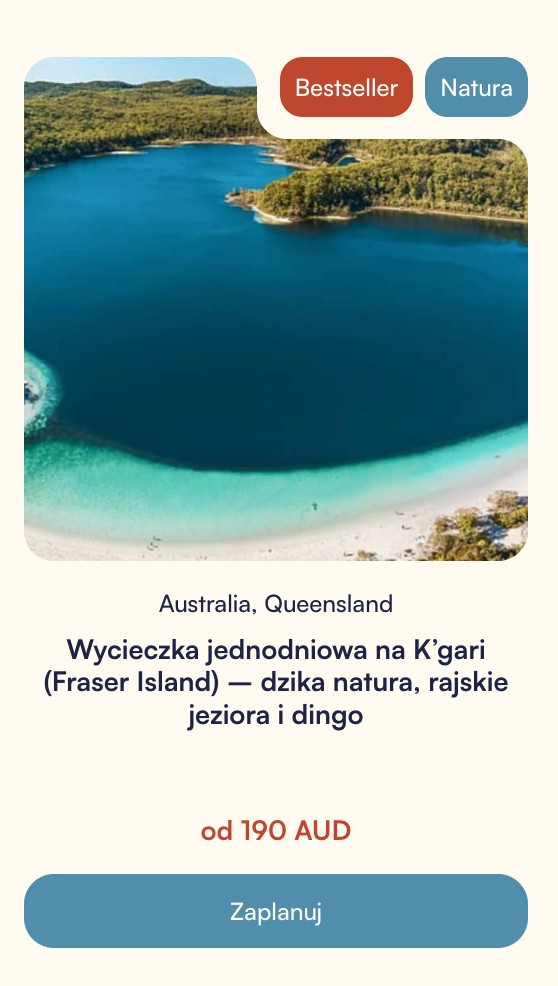 Krzysztof: K’Gari to jedno z tych miejsc, które zostają z Tobą na długo. Kiedy pierwszy raz jechałem po 75 Mile Beach, miałem wrażenie, że jestem na innej planecie, plaża jako droga, lasy deszczowe rosnące na piasku, jeziora tak czyste, że trudno uwierzyć, że są prawdziwe. Ta wycieczka to idealna propozycja dla osób, które chcą poczuć dziką Australię, ale w komfortowych warunkach i z lokalnym przewodnikiem, który zna każdy zakątek wyspy. Polecam ją szczególnie osobom podróżującym samochodem po wschodnim wybrzeżu – jako przystanek między Brisbane a Cairns Jeśli chcesz zobaczyć prawdziwe dingo, zanurzyć się w krystalicznej wodzie i dowiedzieć się, co oznacza „żywa wyspa” – K’gari będzie strzałem w dziesiątkę.