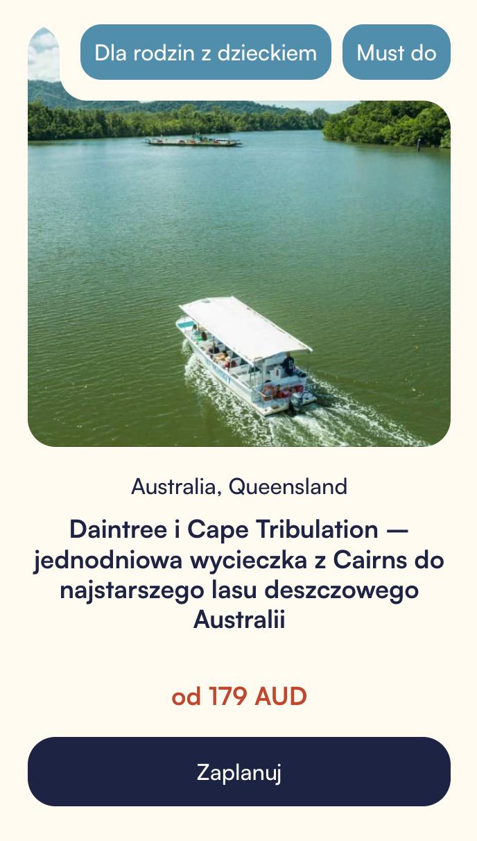 Jednodniowa wyprawa z Cairns do Daintree i Cape Tribulation to spotkanie z najstarszym lasem deszczowym świata i dzikim wybrzeżem północnego Queensland. To zupełnie inny klimat niż rafa,  więcej zieleni, lokalnej kultury i krajobrazów, gdzie las dosłownie schodzi do oceanu. Do tego rejs po rzece z wypatrywaniem dzikich krokodyli.