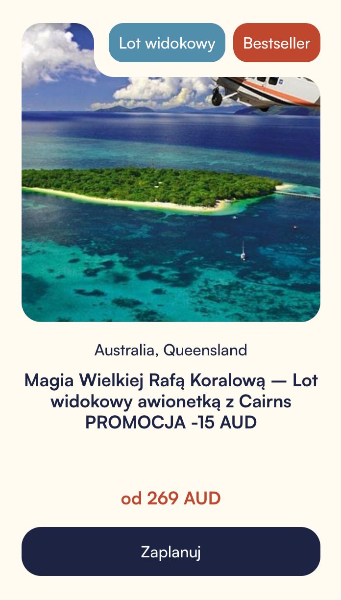 Lot awionetką nad Wielką Rafą Koralową odsłania jej skalę, kolory i kształty, których nie widać z poziomu wody. To krótka, ale niezwykle intensywna atrakcja, idealna jako dodatek do wycieczek morskich z Cairns. Okazja do takiego lotu w Australii – raz w życiu.